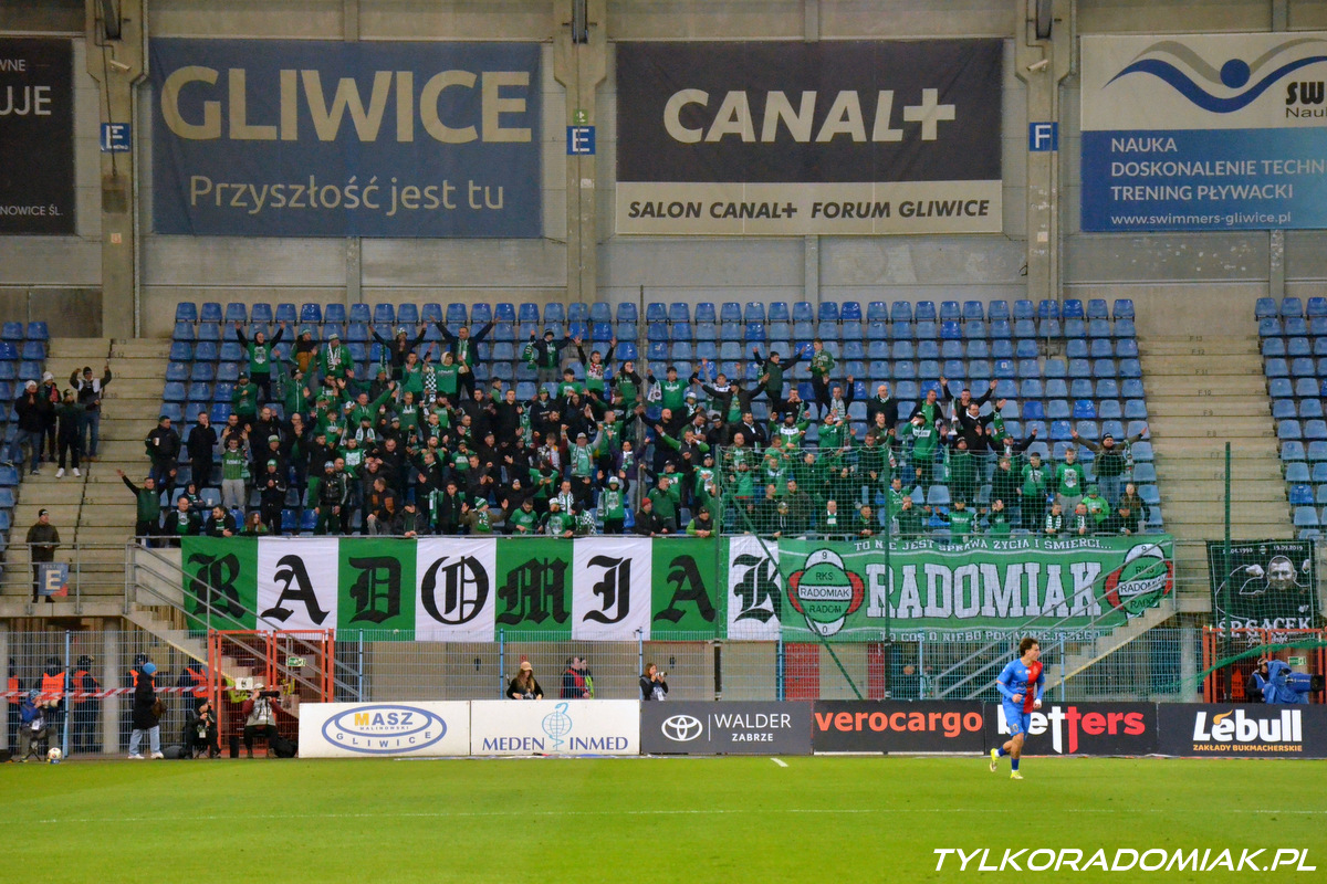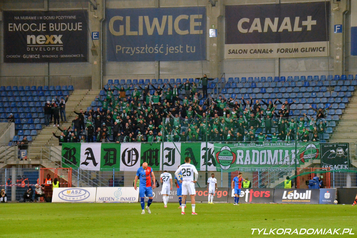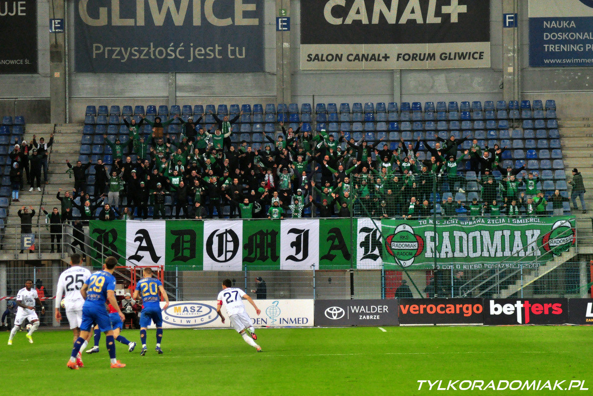 Ponad 150 osobowa grupa sympatyków Radomiaka wspierała "Zielonych" w Gliwicach. Fotorelacja z meczu z Piastem.